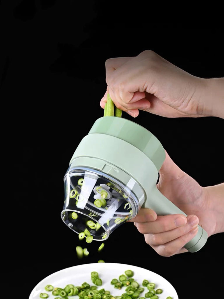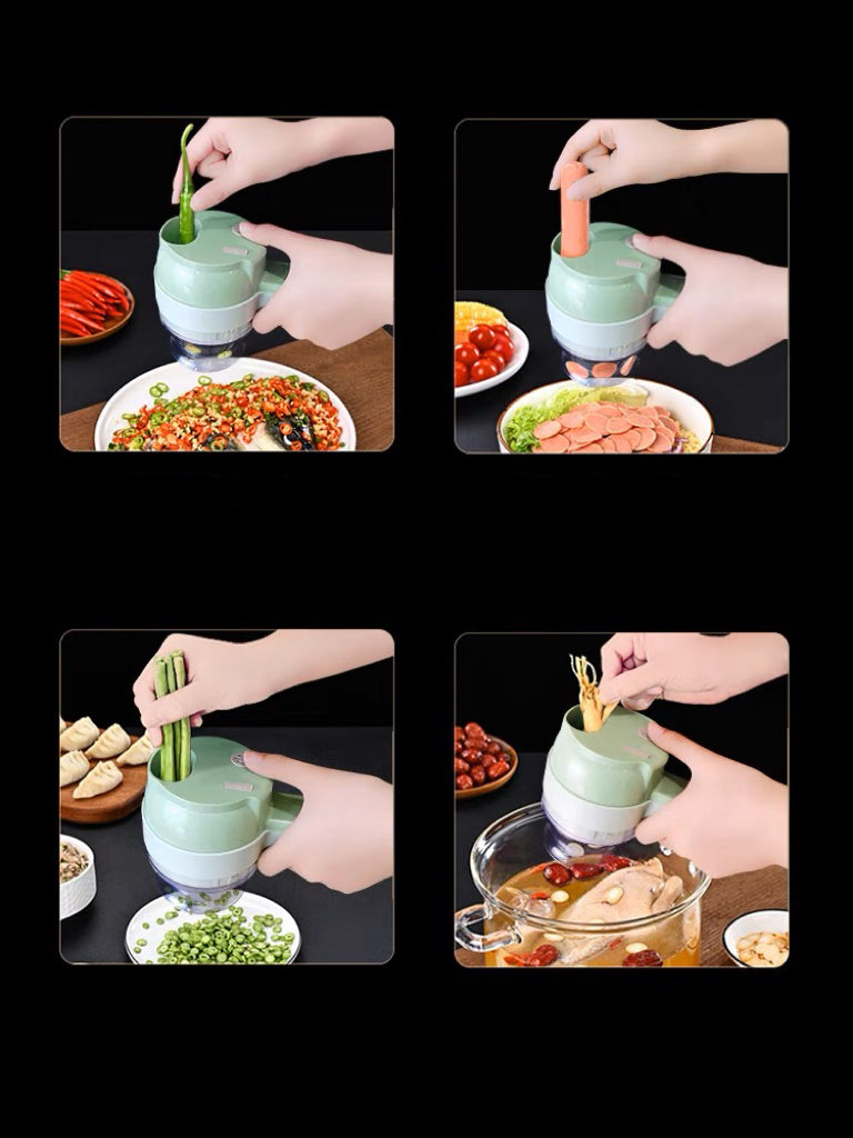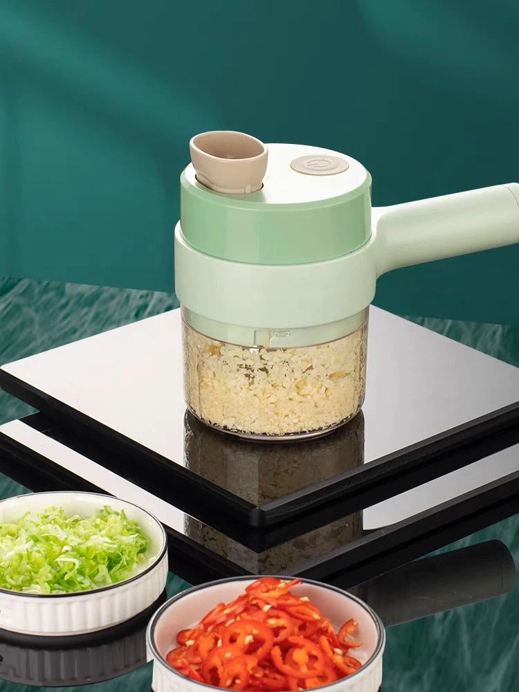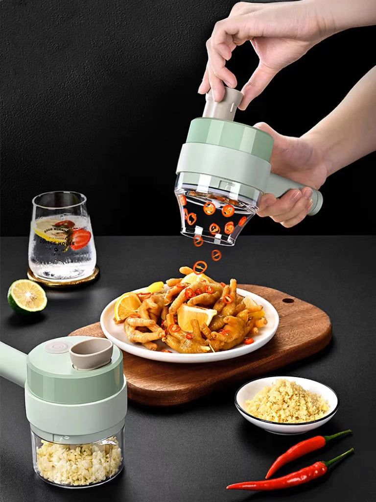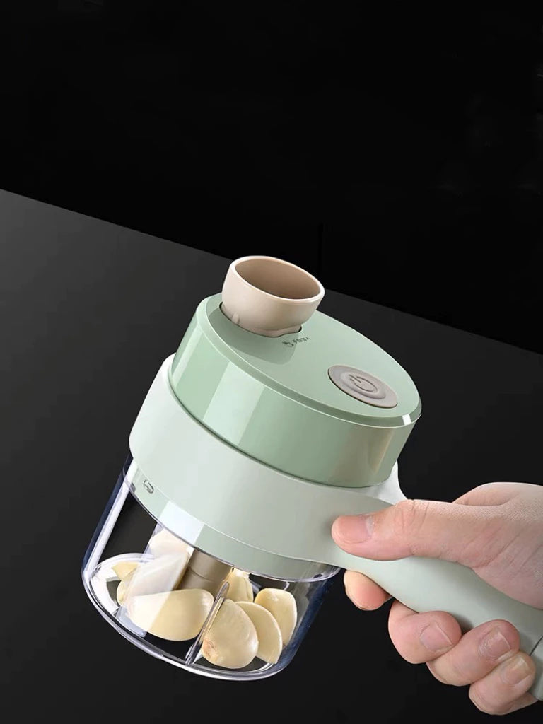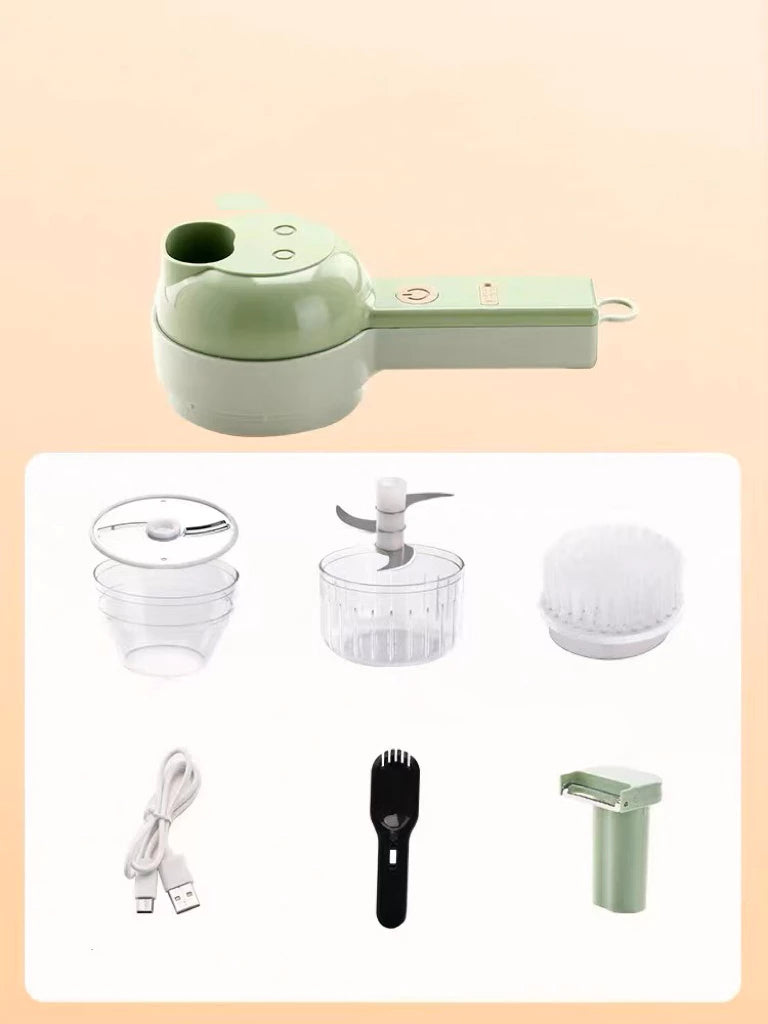 Com ele você pode ter um cortador de vegetais, picador de carne e ainda uma escova de limpeza elétrica ao mesmo tempo, apenas trocando os acessórios do conjunto multifuncional.