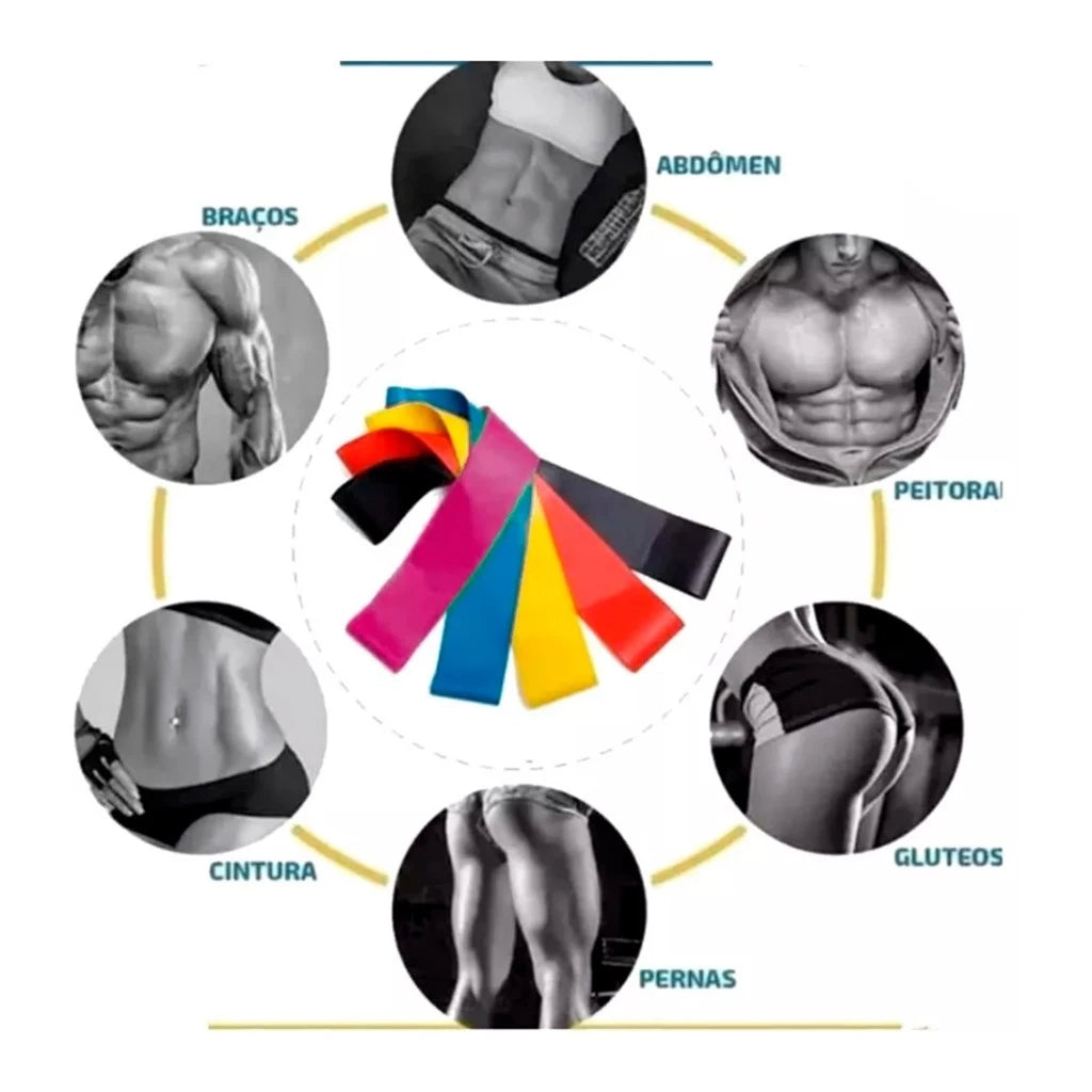 Composto por 5 Faixas elásticas circulares com 5 resistências de diferentes intensidades de força.