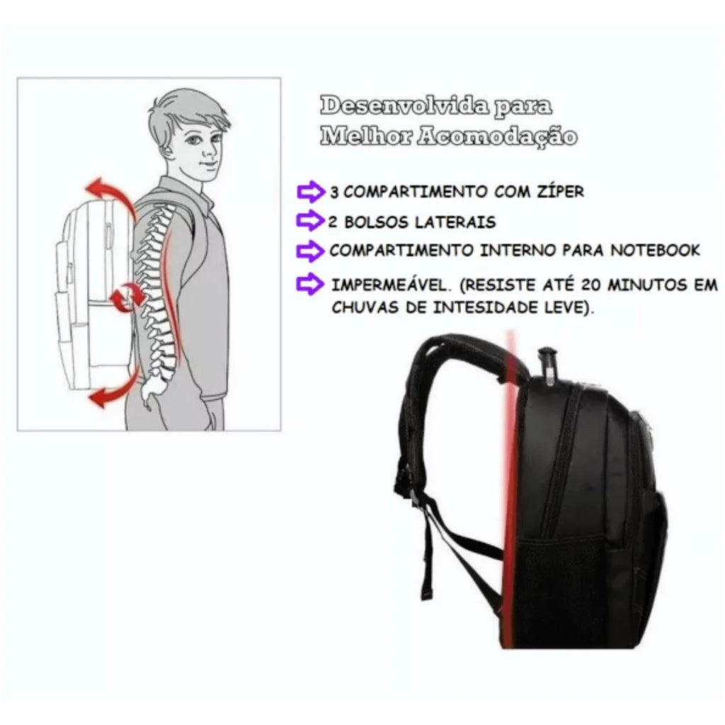 Adquira a sua mochila que foi desenvolvida para acomodar seus pertences com melhor aproveitamento do espaço interno, a mochila possui 2 compartimentos com Zíper além de 2 bolsos laterais e compartimento interno para notebook, além de todo esse espaço a mochila é resistente a água, suportando até 20 minutos em chuvas, ideal para encarar a rotina do dia a dia.