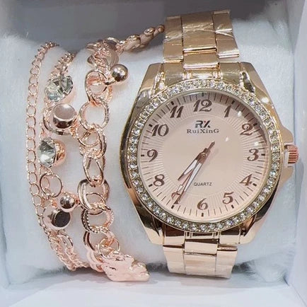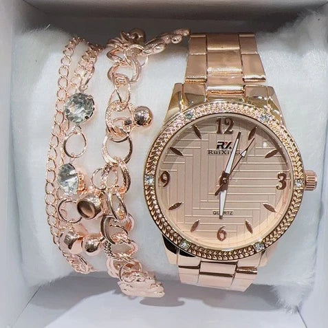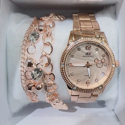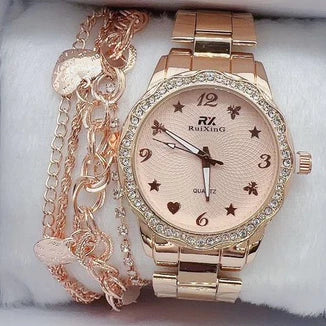 Apresentamos o Relógio Feminino Dourado Rosé à Prova D'Água, acompanhado de uma pulseira deslumbrante para completar o teu look!