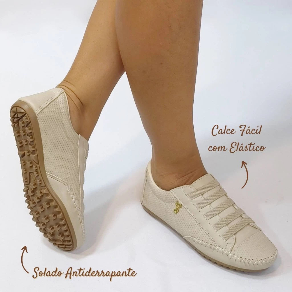 Tenis estilo mocatenis de couro ecologico com costura no bico ,detalhes de furos e com elastico.