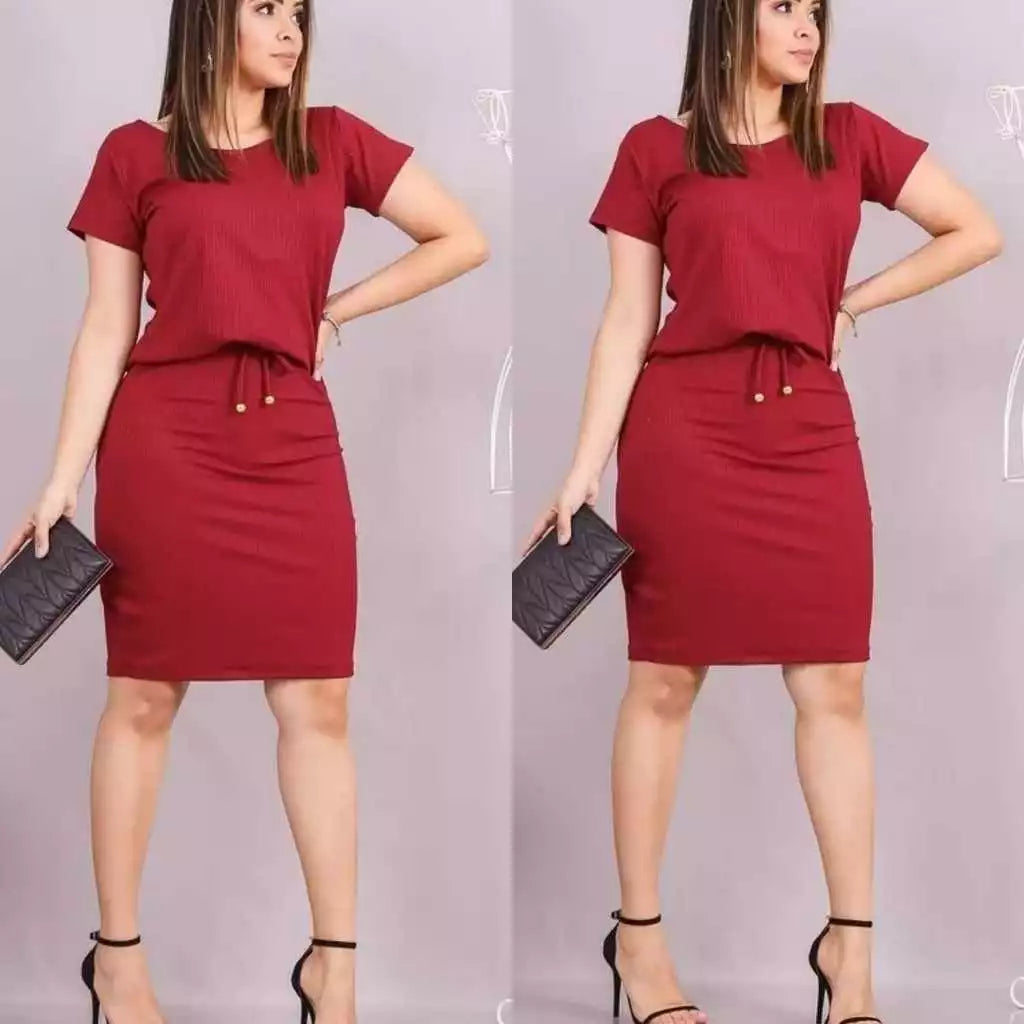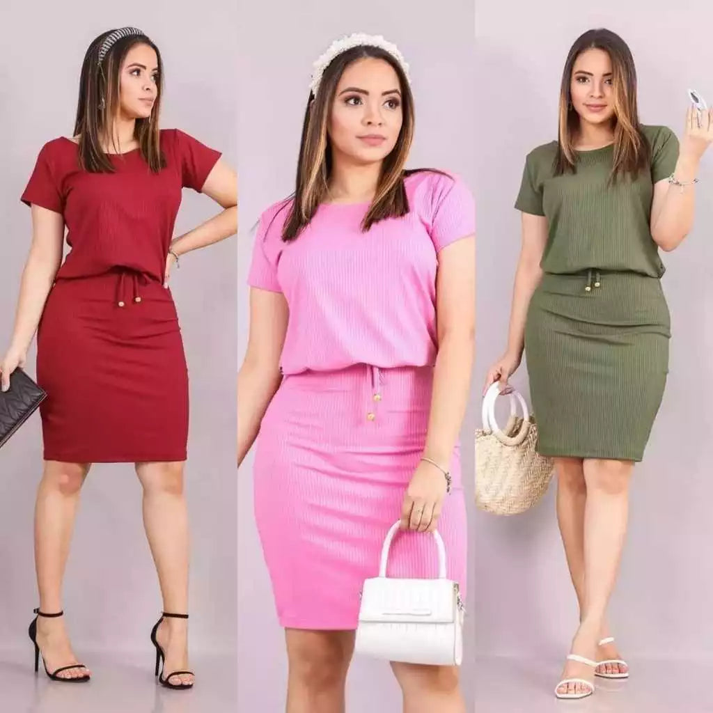 O vestido é confeccionado em malha canelada.